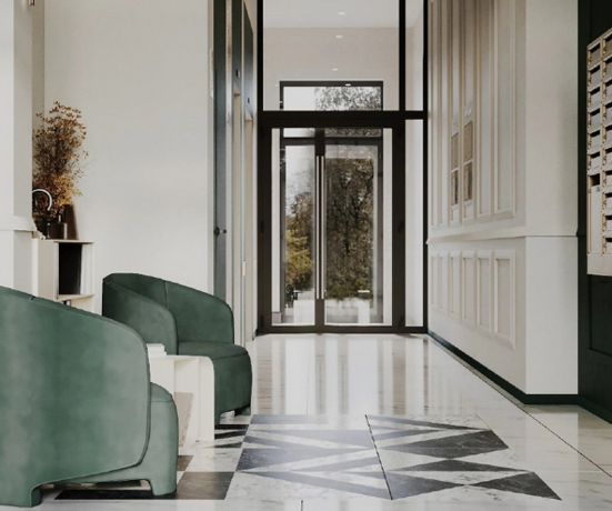 Безбарьерная среда, чтобы жителям было удобнее и безопаснее: входы в лобби — на уровне земли, без ступеней и порогов. Лобби сквозные, так что можно быстро попасть во внутренний двор или на улицу, не обходя дом.
