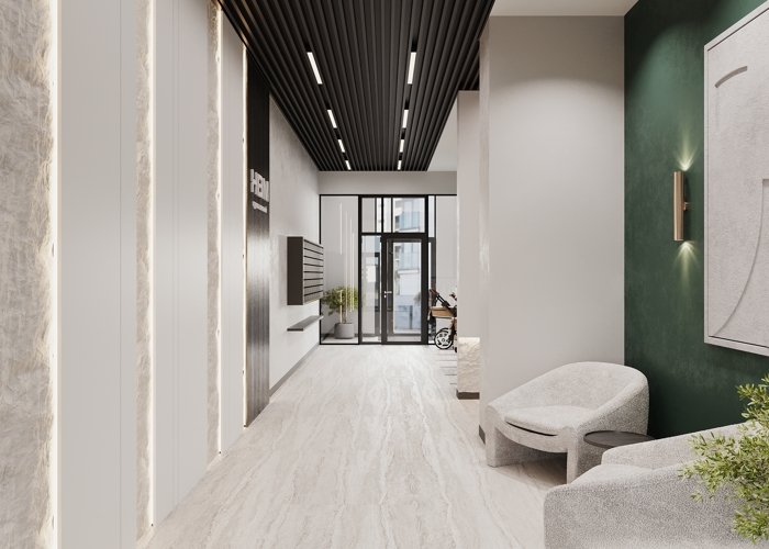 Приятно возвращаться домой и попадать в светлое пространство лобби с местами для отдыха, зеркалами и скоростными бесшумными лифтами.