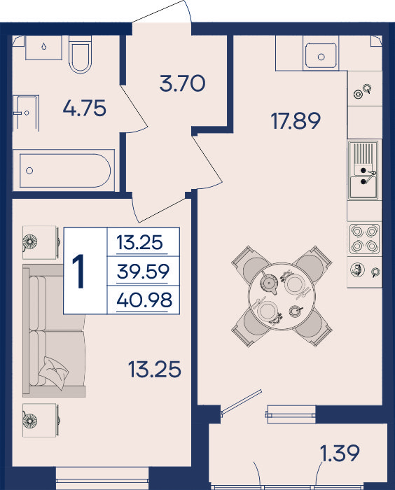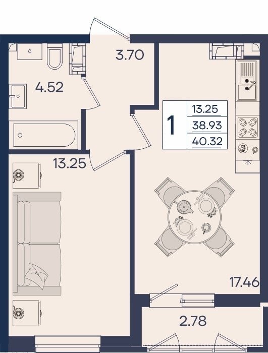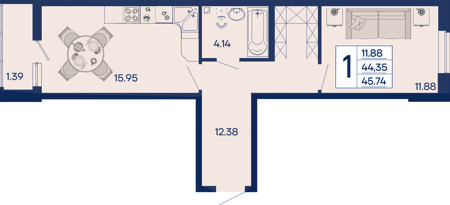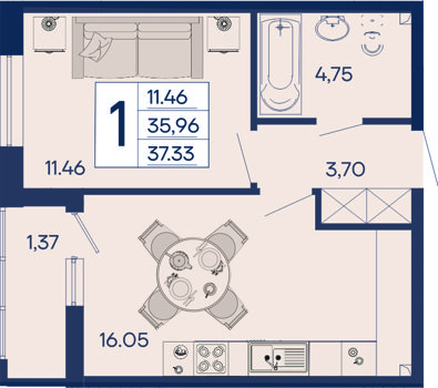 1 ком. от 33,3м² до 40,98м²