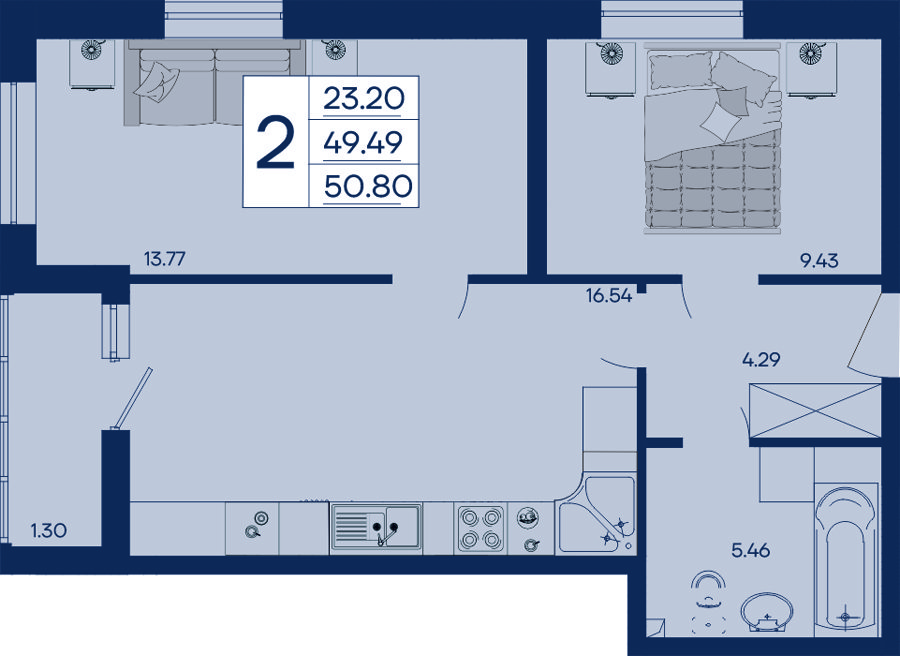 Площадь от 50.80 м2