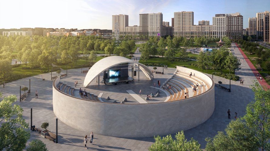 Большая парковая зона на территории комплекса с точками притяжения - амфитеатр под открытым небом, собственное колесо обозрения, фонтан, зона барбекю с уютными беседками.