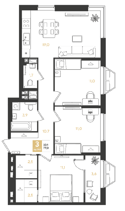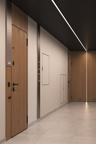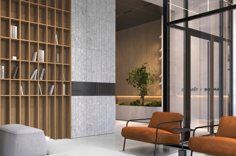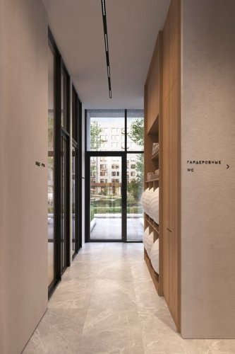 На первом этаже лобби комната для колясок и гостевой санузел.