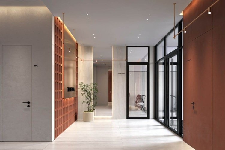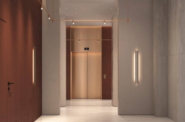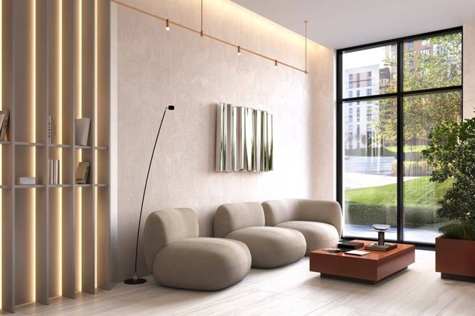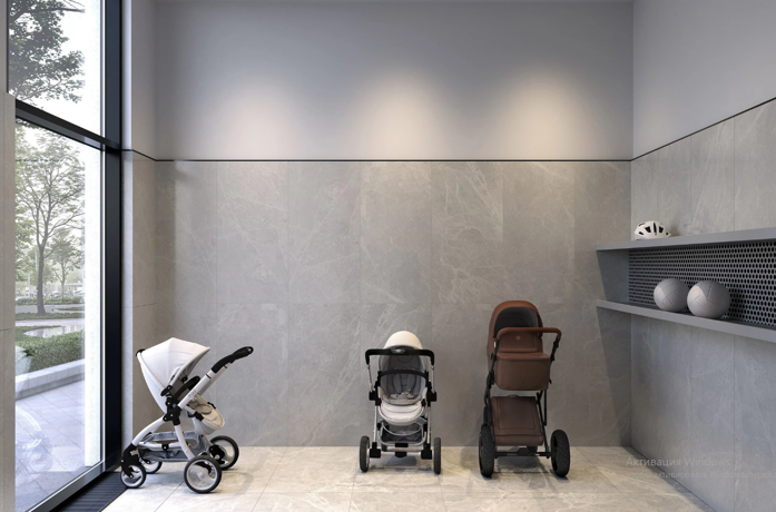 Дизайнерские входные группы с мягкой мебелью и зоной ресепшн. Как приятно возвращаться домой и попадать в атмосферу уюта и света. На первых этажах предусмотрены комнаты для велосипедов и колясок, гостевой санузел и кладовые.