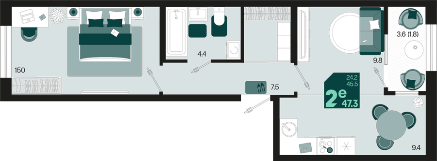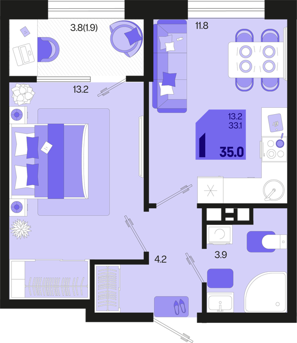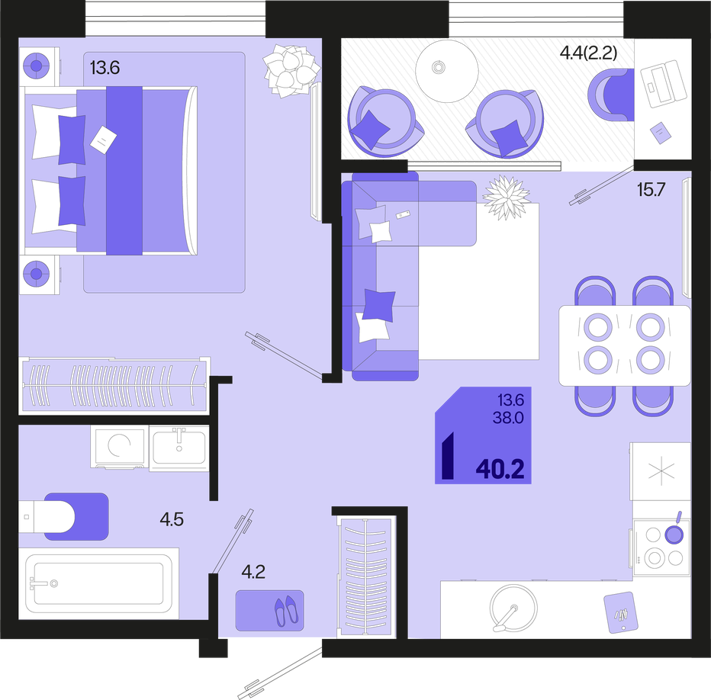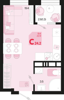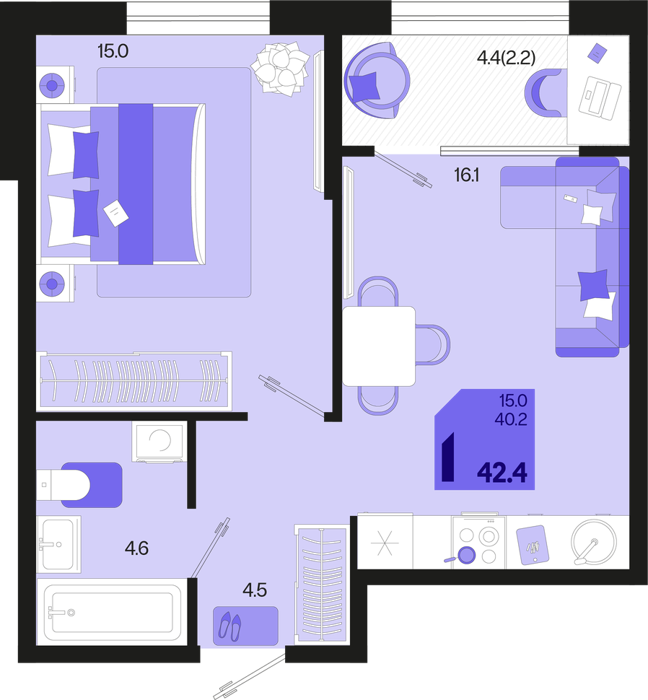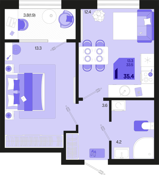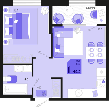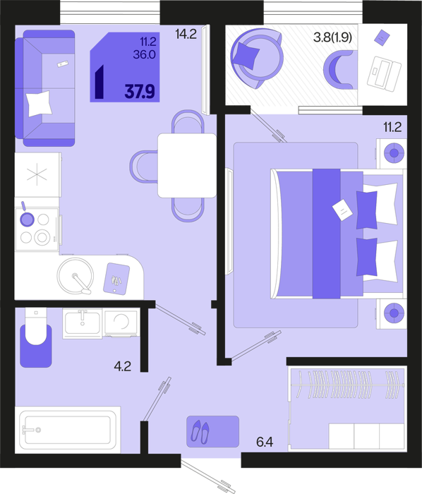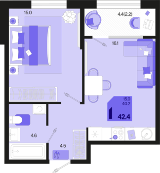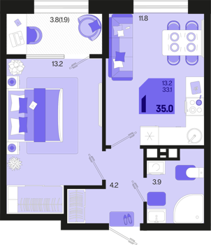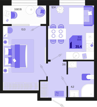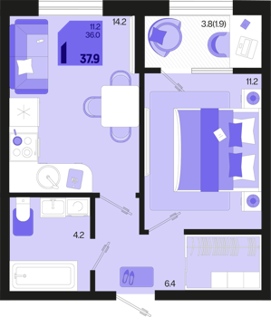 1 ком. от 35,4м² до 42,4м²