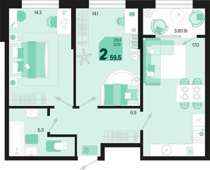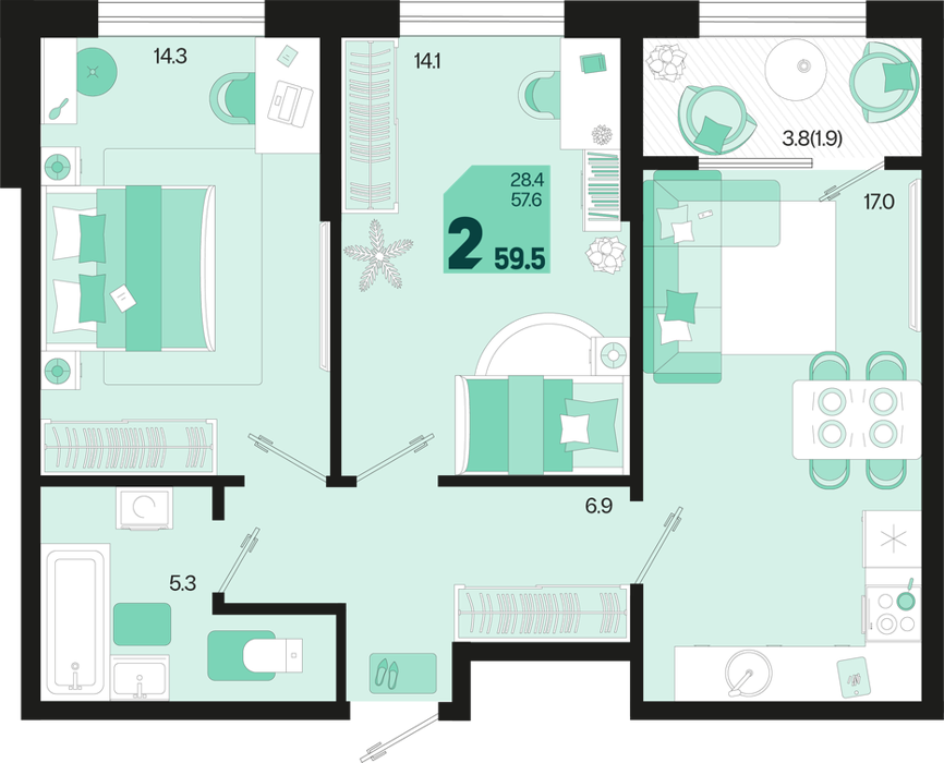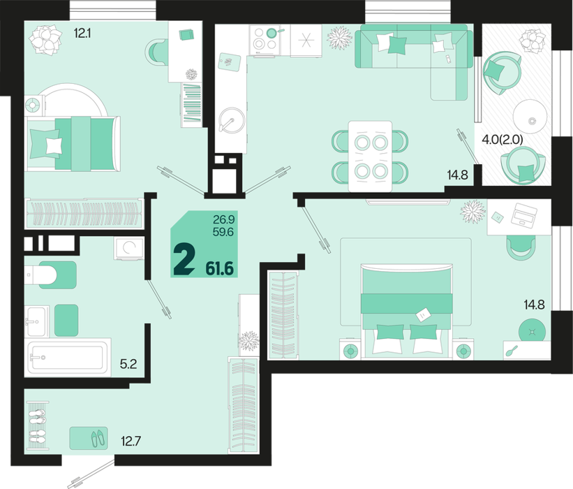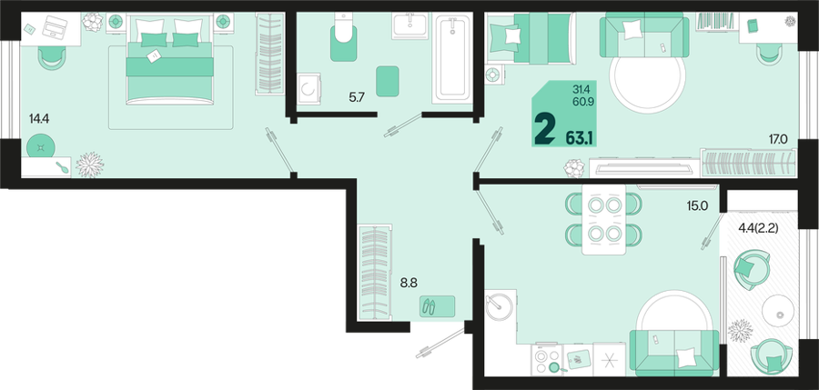 Площадь от 60.8 м2