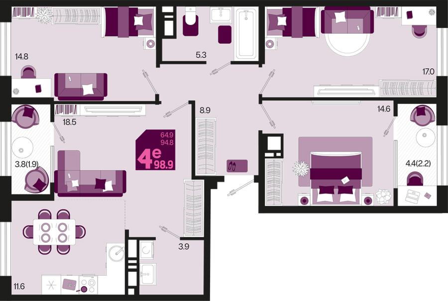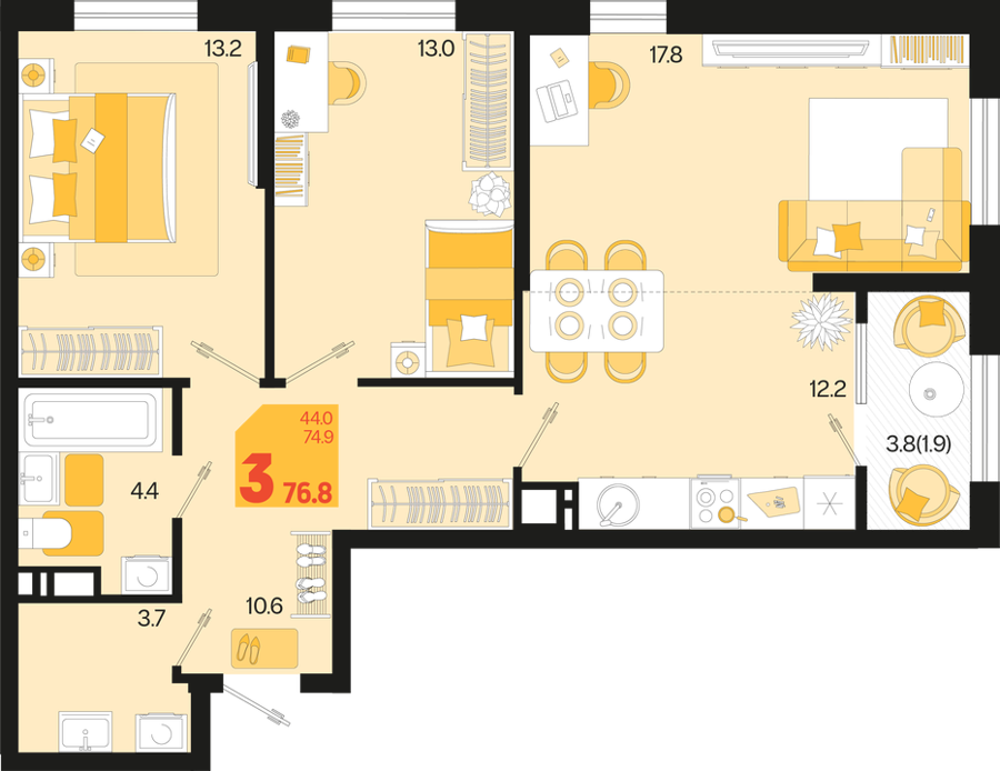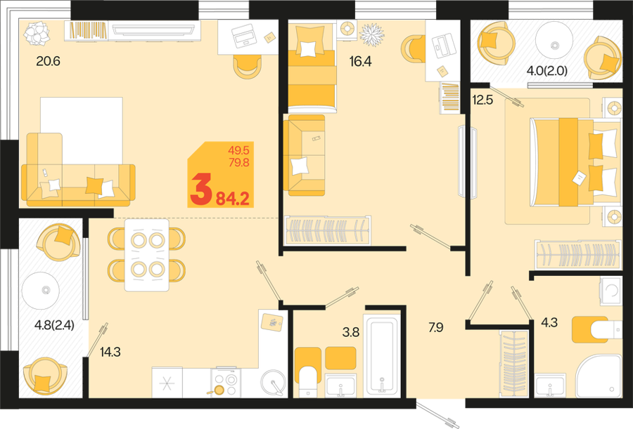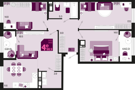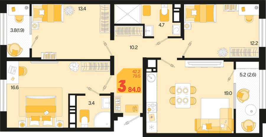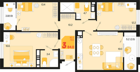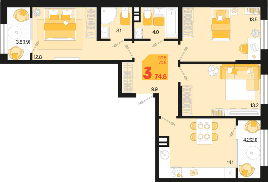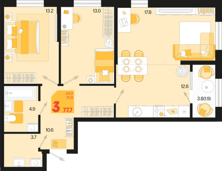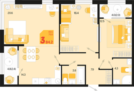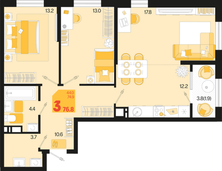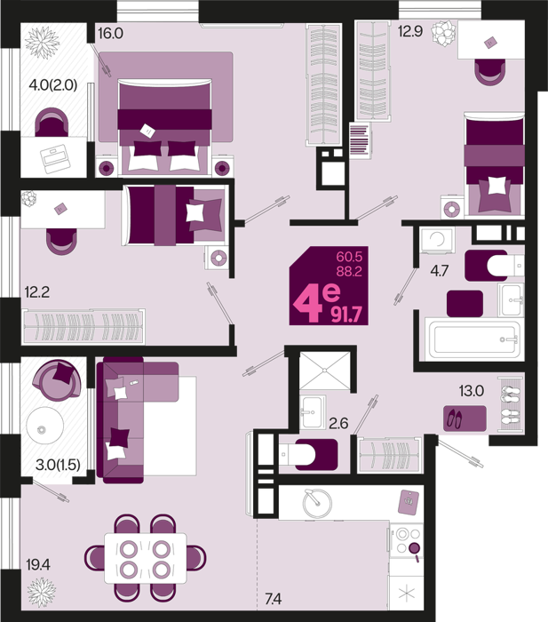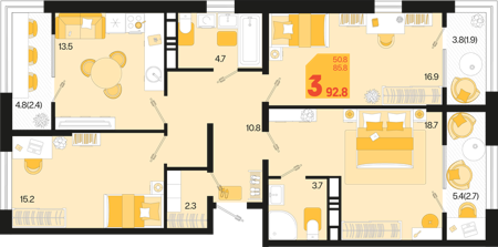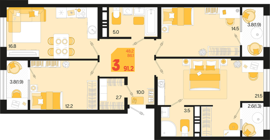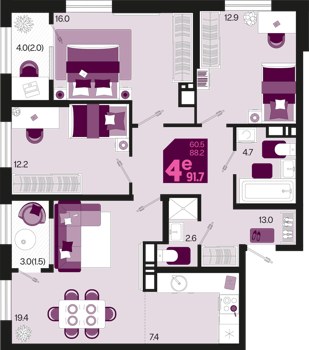 3 ком. от 60,8м² до 91,2м²